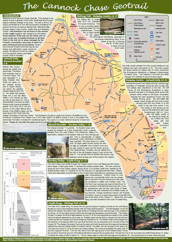 The Cannock Chase Geotrail is a 36km circular route (we do not recommend that you attempt this all in one go) covering the geology and geomorphology of Cannock Chase. It runs from Satnall Hills, past Brocton, Birches Valley to Castle Ring, returning via Brereton, Slitting Mill, Etching Hill, Wolseley Bridge, Great Haywood and Shugborough. The route is mostly in the Lower Triassic conglomerates of the Chester Formation but also incudes the Triassic Helsby Formation sandstones and some Carboniferous Coal Measure strata in the north, east and south of the area.