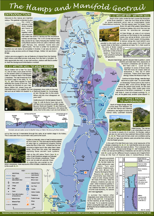 The Hamps & Manifold Geotrail runs from Hulme End along the Manifold Valley, past Apes Tor, Ecton Hill, Wetton Mill and Thor’s cave to Weag’s Bridge. From there it follows the River Hamps to Waterhouses. The 13km route provides easy access since it mostly follows the Manifold Track, a resurfaced section of the old Leek & Manifold Valley Light Railway line. It mostly passes through the Ecton and Milldale Limestone Formations, roughly following the trace of the Ecton Anticline.